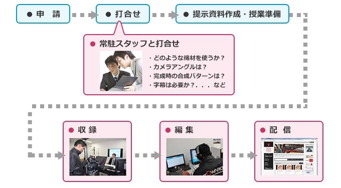 授業収録の流れ赤色の部分は常駐スタッフが全面サポート